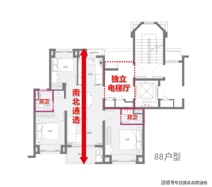 具体而言,建面约88㎡比同级户型多了“1卫”,免去家庭抢厕所的烦恼,大大提升居住体验,未来在二手房市场也更具竞争力。