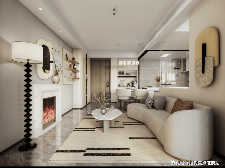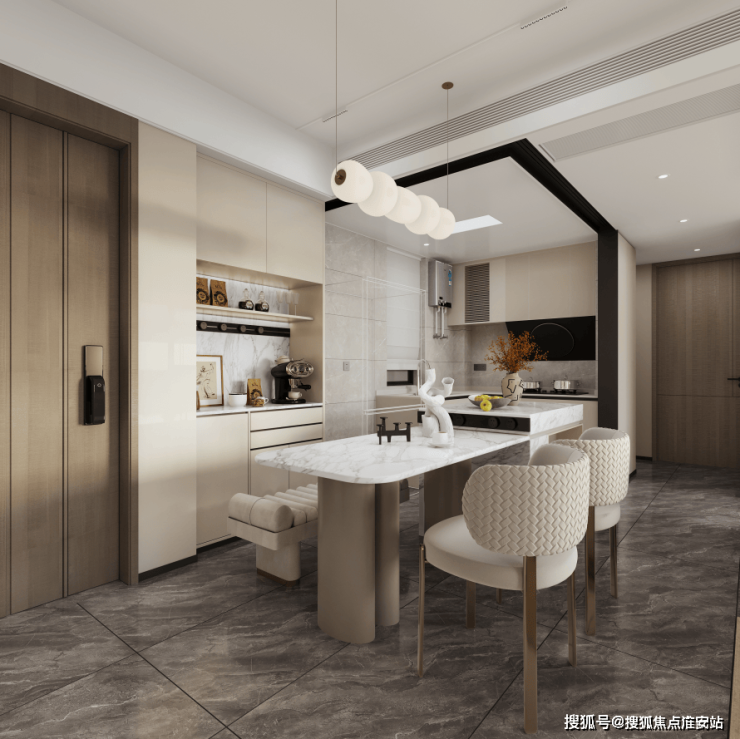 客餐厨一体化,既减少了过道的浪费;又打破了传统布局中的“隔阂”,几个功能区独立又互通,将空间功能进一步放大。