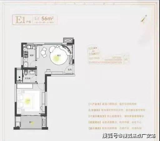 建面约55㎡1房1卫户型,低总价优质上车小户型,做到了双开间朝南+卫生间干湿分离+卧室带飘窗+客餐厅相连,小而美的一个户型。