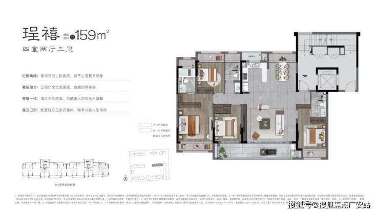 中文:户型设计聚焦高端改善需求,主力户型为建面约110-180㎡的三至四房,注重空间尺度与功能适配;110㎡户型采用三开间朝南设计,搭配大阳台与全景落地窗,采光与观景效果俱佳;180㎡户型规划四房三卫,配备独立衣帽间与双套房,满足高端家庭对私密性与舒适度的双重追求。 English:Unit design focuses on high-end improvement needs, with main units ranging from 110 to 180㎡ (three to four bedrooms), emphasizing spatial scale and functional adaptation. The 110㎡ unit features a three-opening-south design, paired with a large balcony and panoramic floor-to-ceiling windows for excellent lighting and views; the 180㎡ unit offers a four-bedroom, three-bathroom layout with a private walk-in closet and dual suites, meeting the dual needs of privacy and comfort for high-end families.