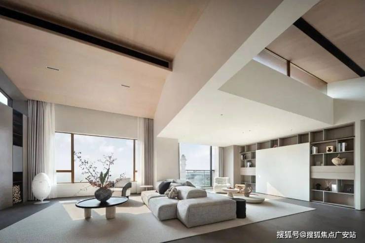 倾斜的吊顶和特意做出的错落 “断层”,增强了空间的纵深感。这种感觉不是来自单一方向,而是四面八方的张力共同形成的。