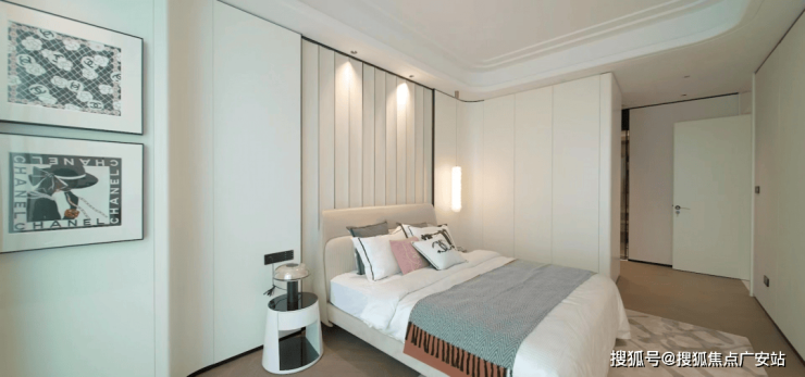 次卧的设计比较简约,经典的色调让房间一直很温暖。独特的拼贴式吊顶设计解决了不规则的角度和边缘问题,空调出口也做了美化,不影响美观。一侧的背景墙里嵌入了衣柜,保证了实用性。整个空间有一种平静又永恒的美感,简约风格的魅力很明显。