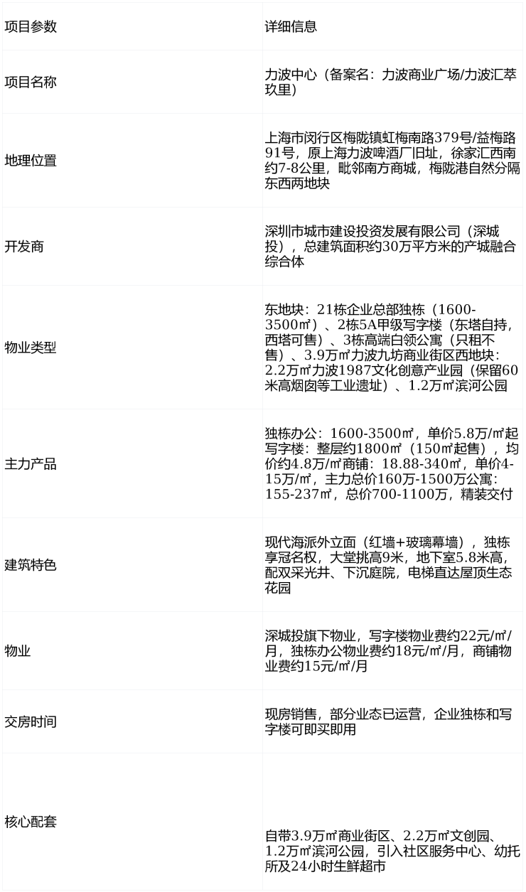 力波中心是上海闵行梅陇板块稀缺的30万方产城融合综合体+工业文化IP项目,核心价值在于产城融合生态+工业遗址文化+企业独栋专属价值+优越交通区位+现房保障的组合优势,适合预算9000万起的大型企业总部、追求独特办公环境的文创科技企业,以及看好闵行中部科创商务发展的投资者。