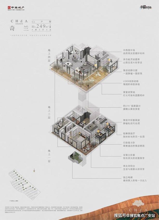 中间套下叠“旗枪”户型为例,利用地势高差做了下沉式庭院,由于是坡地地形,所以即便是地下空间,也有大面采光;二楼则设计了挑出露台,拥有大面积室外空间。