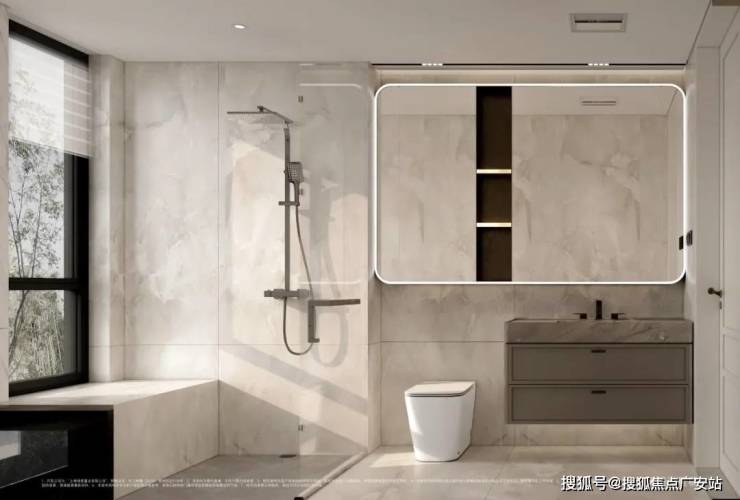 配备美妆龙头,大容量镜柜可收纳洗漱用品,利用墙面空间设置壁龛,便于存放毛巾、衣物便于取用。