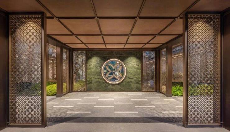 主背景雪山兰奢石,纹如凝山,静显稀贵。穿过大门就是二进迎客,借用柳岸闻莺的空间布局,还原“深柳叫黄鹂,清音入空翠”的西湖风光,同时还复刻花港观鱼的锦鲤池,营造临渊羡鱼的惬意场景。
