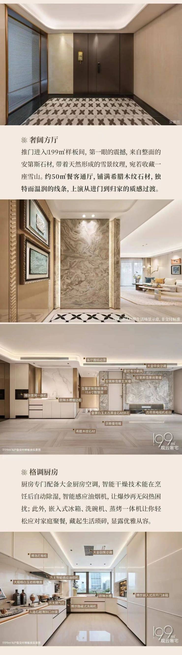 室内精装大量使用石材,除了大门、公区、会所等区域,室内空间同样精心运用了皇家白玉、劳力士灰、安第斯雪景、希腊木纹等高端石材,其独特纹理与温润质感,为空间注入了自然优雅的格调。在大型设备方面,大金中央空调、菲斯曼地暖、霍尼韦尔新风系统等国际品牌产品,彰显了不凡的品质。厨房配置了方太油烟机、燃气灶,以及博世蒸烤一体机、洗碗机、冰箱等高端电器。卫生间则选用了杜拉维特盥洗盆、马桶、浴缸,搭配汉斯格雅龙头、淋浴花洒,在同价位项目中实属罕见。