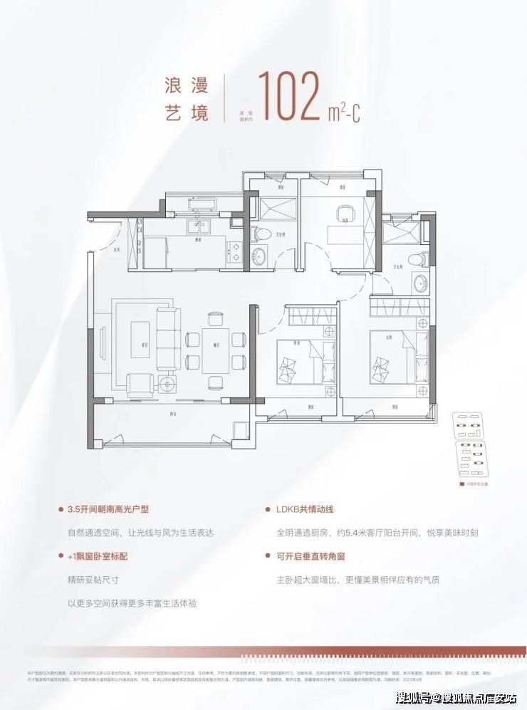 这个户型相信年轻人更喜欢,毕竟,哪个年轻人会拒绝270度采光的客厅呢!这套户型同样拥有约80%的高得房率、灵活机动空间等优点,而且布局上隐私性更强、窗墙比更高!主卧和次卧是完全隔断的,从归家动线上来看,主次卧的轨交动线几乎不重叠。这种设计很适合两代同住的家庭,因为很多年轻人因为下班晚,是不希望打扰到长辈的。南向窗墙比达到约41%-45%,空间通透感十足!租住过上海老公房的朋友很多都对高窗墙比有一定执念,这个户型相信打动了不少人的心!102m²的户型也很难让人不爱: