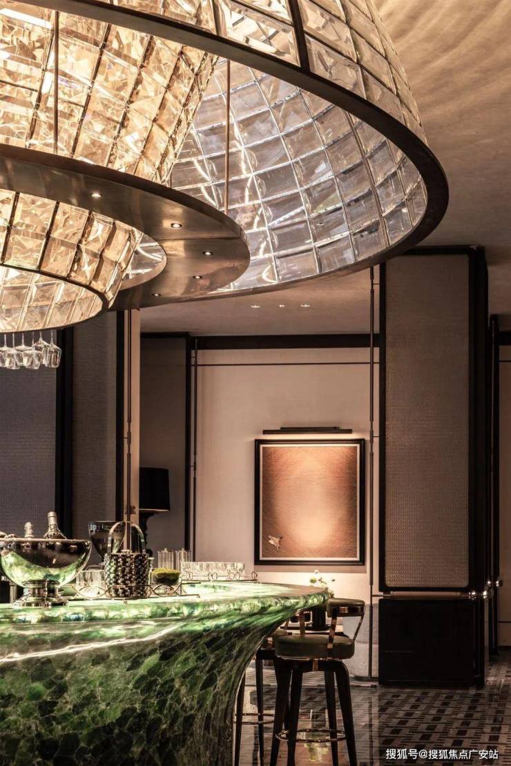 在这里,你可以看到造价超百万的绿水晶奢石吧台、手工打磨璀璨水晶灯↓