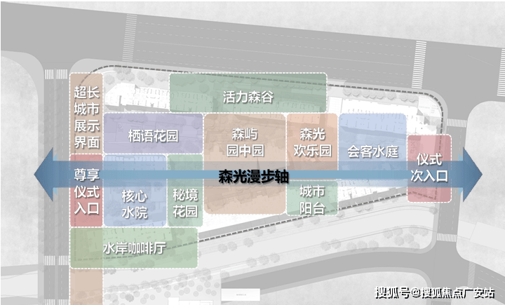 以一条尊享轴线(森光漫步轴)从东往西串联核心水院、秘境花园、森屿园中园、会客水庭。
