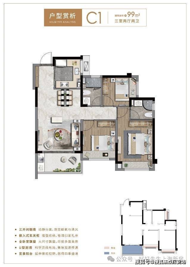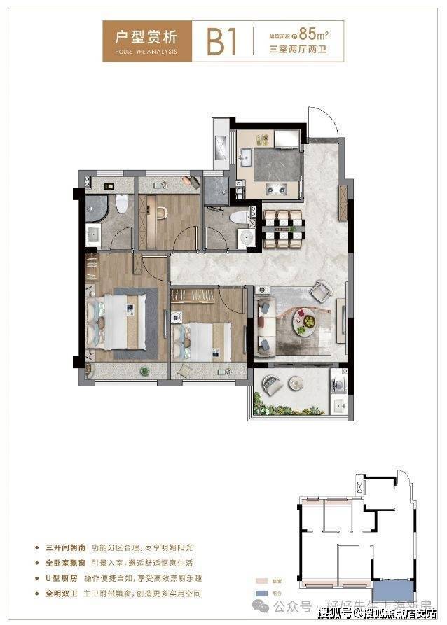 约85平三房户型,更是做到了三开间朝南,全卧室飘窗,拥有超大赠送面积,全明双卫,甚至主卫也附带飘窗,实用性拉满,而且该户型大部分房源总价在230万左右!