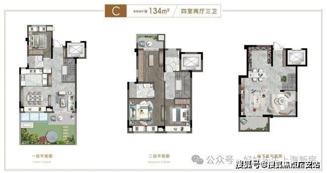 约123平上叠3房户型,共上下两层,全明设计,格局开阔,宽景阳台,上承天空,下承生活。