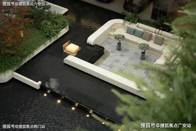穿过大门,前场水院豁然展开,整体面积约660㎡,设计取意“天圆地方”,中央点缀水滴造型艺术雕塑,营造出强烈的归家仪式感与沉浸体验。