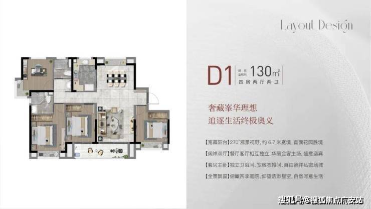 建面约130㎡4房2厅2卫,做到了四开间朝南+南北通透+主卧套房设计+双阳台设计+卫生间干湿分离,“一步到位”大4房,空间尺度非凡。