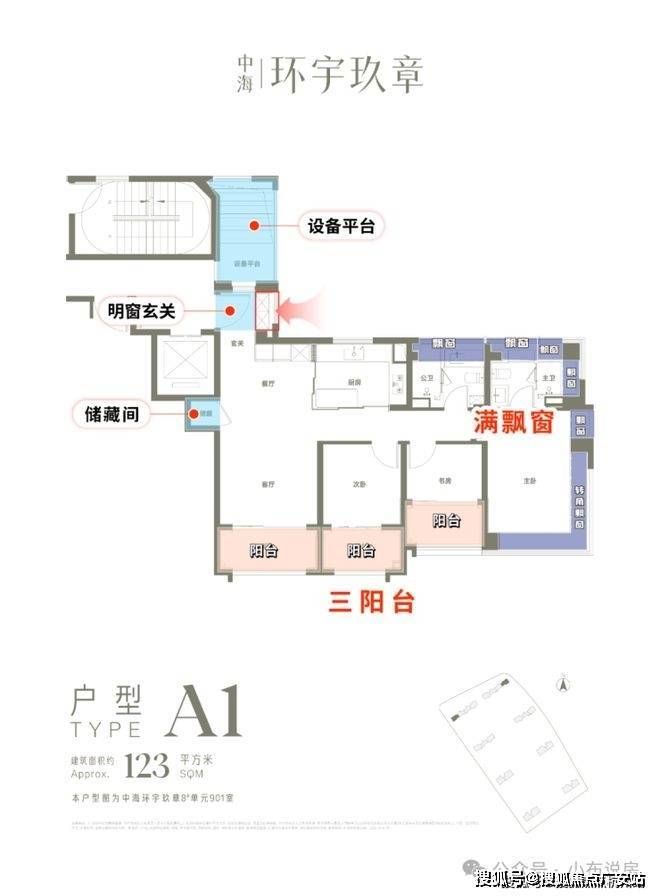 以建面约123㎡3房为例,区别市面上多数仅单或双阳台布局,该户型四面宽朝南+罕见的南向三阳台,实用性和采光度更强。
