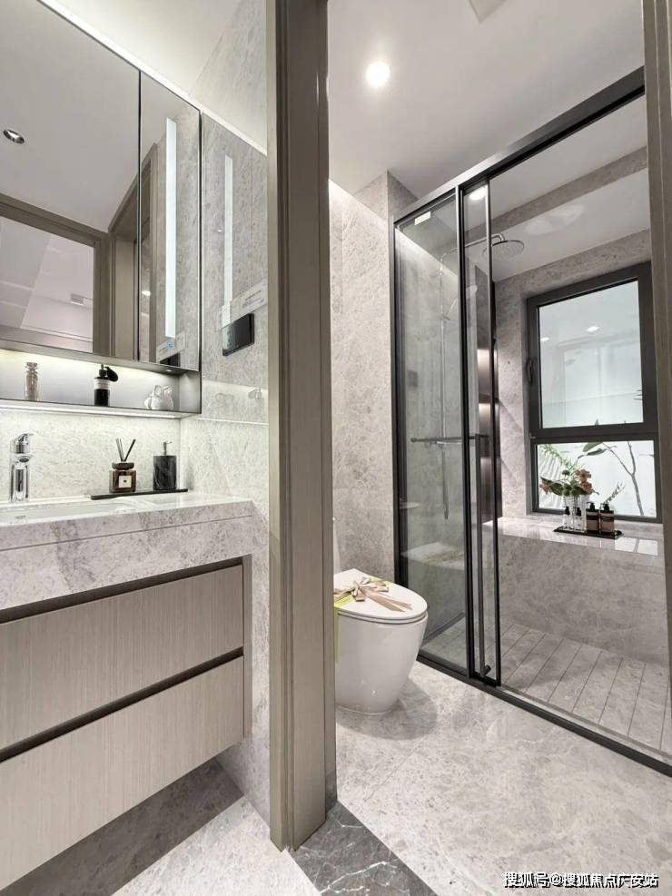 卫浴空间同样精彩,采用高仪的台盆、龙头、智能马桶、淋浴花洒等,主卫创新定制“美妆冰箱”,满足业主对美妆、护肤用品冷藏的需求,足见开发商对成本的舍得。