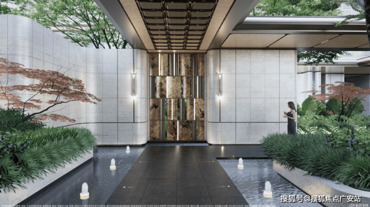 在门庭外,辅以两侧具有仪式感的跳泉水景,将建筑的圆弧美感与自然水景相合,共同构成海上·清和玺“贵雅清和”的城市界面.