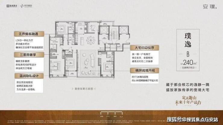 户型上,即将推出的240㎡藏峯大宅,打造约6.4米奢阔南厅,阳台双动线规划设计,完美兼顾采光、视野与实用功能,中央“水吧台”十字洄游设计,带来更丰富的客餐厅社交体验与生活动线,公区与卧室空间的比列适中,保证每一种生活方式的舒适度。
