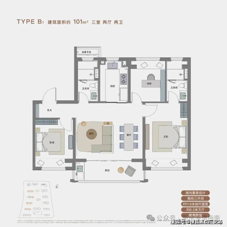 建面约101㎡B1户型尺度感惊人,约5.2米南向面宽的客餐厅以及阳台,为室内带来了非常出色的采光度。