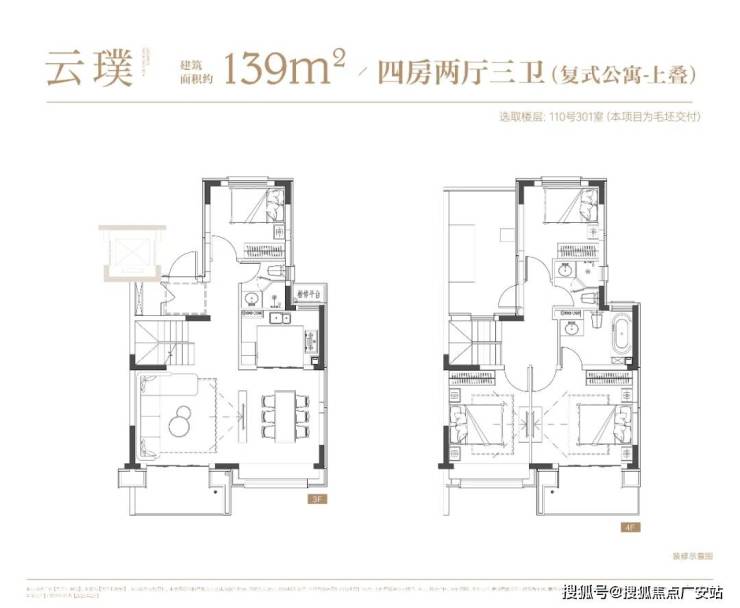 4层叠墅分为上/下叠,上叠建筑面积约139㎡,下叠建筑面积约142㎡,均为4房设计。
