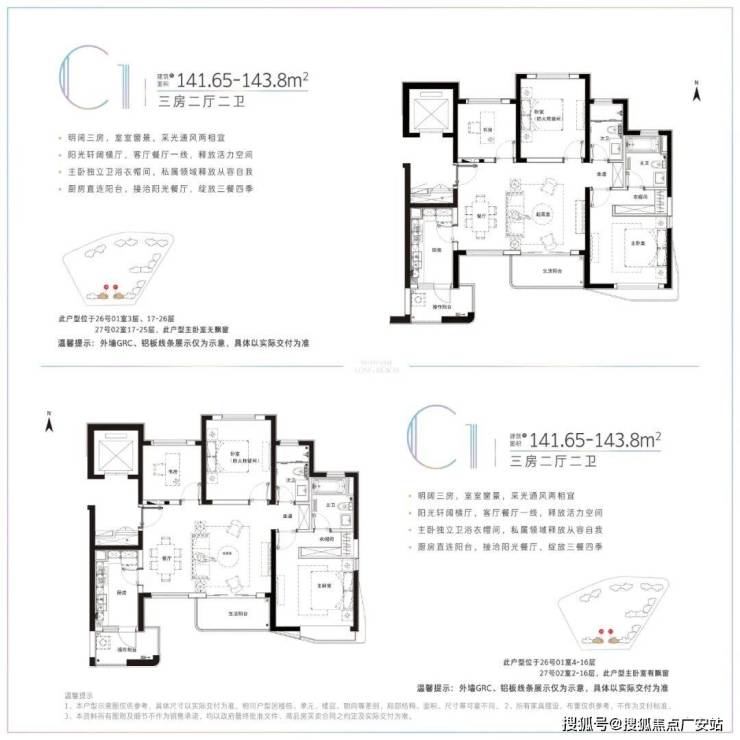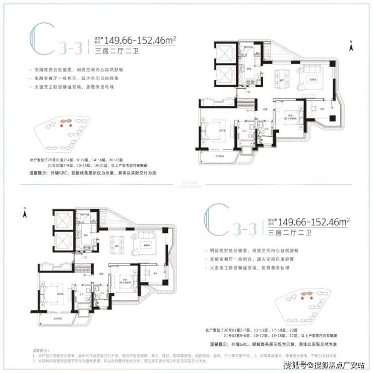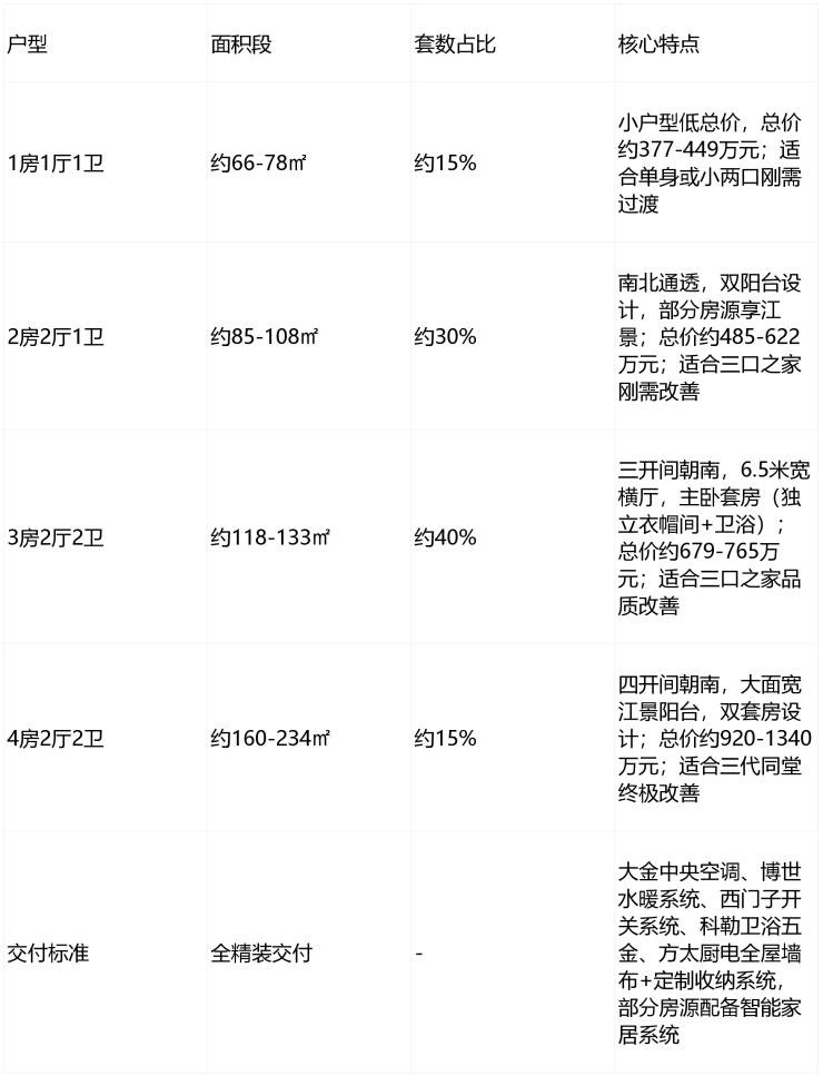 户型优势:主力户型78-133㎡(1-3房),采用南北通透、全明设计,部分户型拥有270°环幕观江视野,南北双向长阳台(市面少见),增加采光与景观视野,扩展使用空间