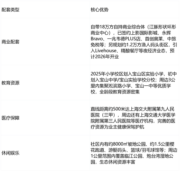 生态稀缺:拥有约1.75公里黄金滨江岸线,社区内规划约10万㎡滨江公园,涵盖滨江步道、亲水平台、景观草坪等,步行5分钟可达江边,是北上海罕见的一线滨江居住区