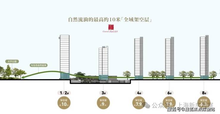 为了最大化内外景观视野,整个社区规划了行业标准内出挑的一层架空层,最高的10米,主体7.9-9米,最矮的也有6.3米。