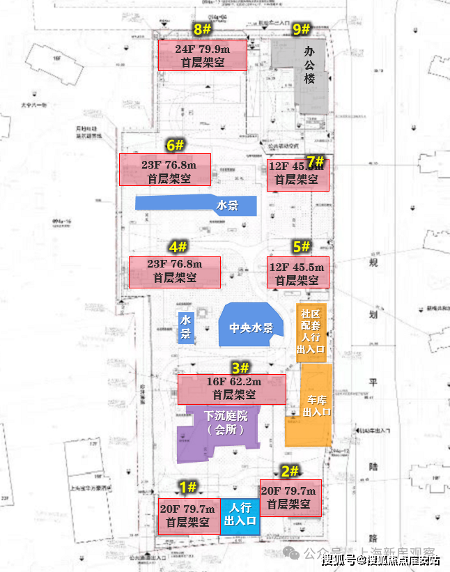 该方案亮点颇多,总计八幢高层和小高层设计,最南端的1#和2#楼均设置有私家泳池,而且还在19F采用了住宅楼当中较为少见的悬挑工艺,延伸出了一定的使用空间,个人预估这两幢会是配置大平层豪宅产品。