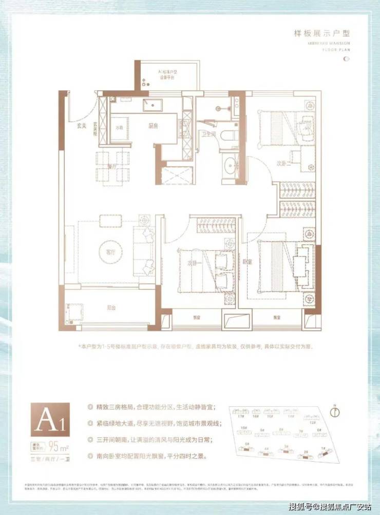 建面约95㎡户型, 3室2厅1卫的空间,可以满足各种家庭生活需求。户型方正规整,功能分区合理,动静皆宜; 三开间朝南、南向卧室均配置阳光飘窗,房间通透明亮,阳光美景尽享。