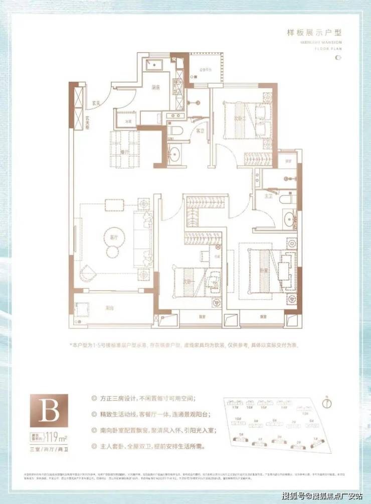 建面约119㎡户型,3房2厅2卫,户型 三开间朝南、动静分离,南北通透。另外,户型设计了精致的生活动线, 客餐厅一体,连通景观阳台;南向卧室均配置飘窗,引阳光入室; 主人套卧、全屋双卫,提前安排生活所需,让业主的生活舒适度上升了一个层级!
