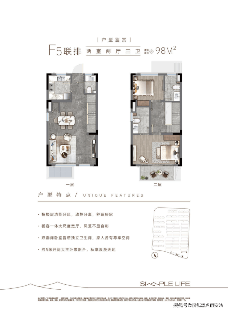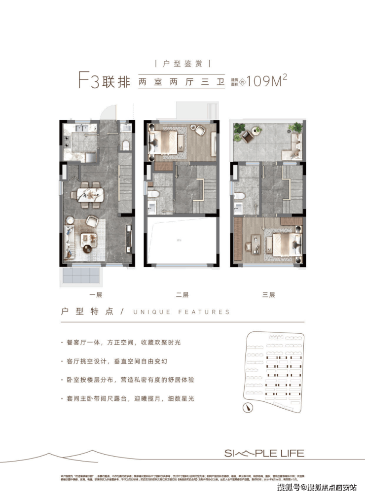 项目合计47幢楼,其中洋房12幢554套,联排33幢301套,项目整体分两批次推出,总计855套。采用人车分流,即保证社区整体设计的美观,又保证业主的安全性,车位有920个,做到1:1的比例。