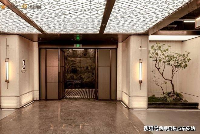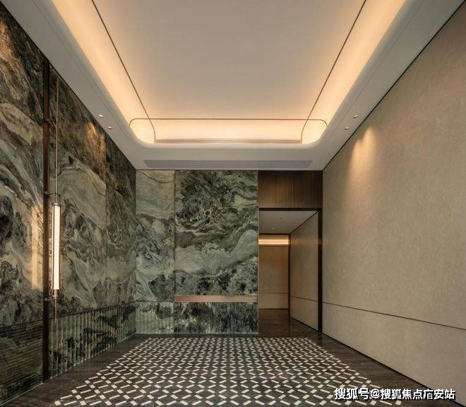 双大堂系统则将尊崇感贯穿于归家动线的每一程。社区主入口大堂以酒店式的空间尺度与艺术化陈设,完成从城市到社区的过渡;单元入户大堂则进一步将仪式感升华,精选雪山飞狐、高山流水等珍稀奢石作为主背景,天然形成的山水纹理宛如艺术画卷。搭配精心设计的艺术吊灯与金属细节,营造出兼具归家温馨感与艺术馆般精致度的“第二客厅”。从公共到私属,双重大堂不仅实现了功能分区,更通过材质与光影的层层递进,完成了情绪上的铺垫与升华。
