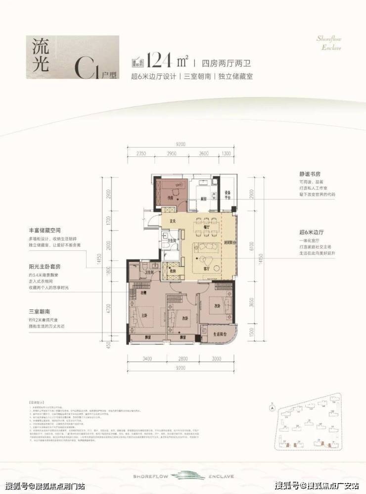 建筑面积约124m²C1户型,四房两厅格局,三方朝南+静谧书房,特别适合像家里有二孩且想改善居住条件的家庭。它最大的亮点就是,一进门便是大边厅,外面还连着个约6.1m的大阳台,让整个屋子采光特别亮堂。而且四房的设计,能让家里每个成员都有自己相对独立、不受打扰的私密空间。