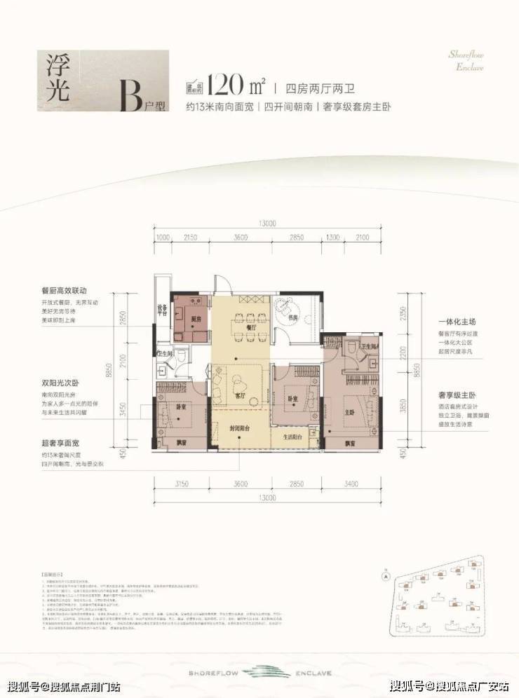 建筑面积约120㎡B户型,采用了四开间朝南的排布方式,总面宽约13米。三个卧室和餐客厅均朝南,让每一个空间都拥有南向阳光平权。餐客厅和次卧连接了一个双联大阳台,双飘窗,赠送面积多。而且客卫就在次卧边上,生活起居也是便捷不少。