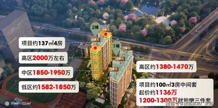 ①、项目约100㎡3房中间套,起价约1136万,1200-1300万就能瞰三件套,高区约1380-1470万;边套双270°飘窗+景观,定价适当贵一点。