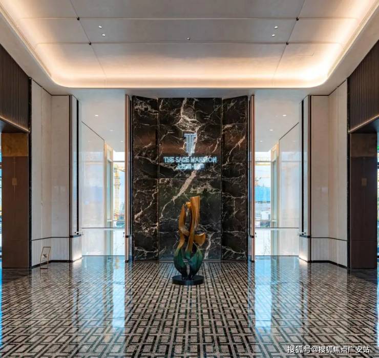 大堂背景墙同样选用Prada绿奢石,锦鲤纹理精雕细琢,与艺术雕塑相映成趣;