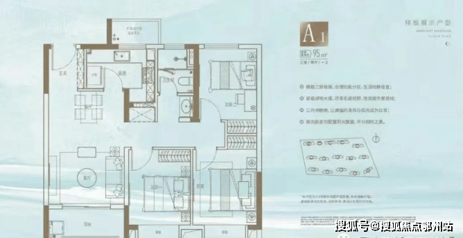 A1户型|95平米【3房2厅1卫】√南北通透,三开间朝南√紧邻绿地大道,享无遮视野√卧室配置飘窗,提高空间使用率