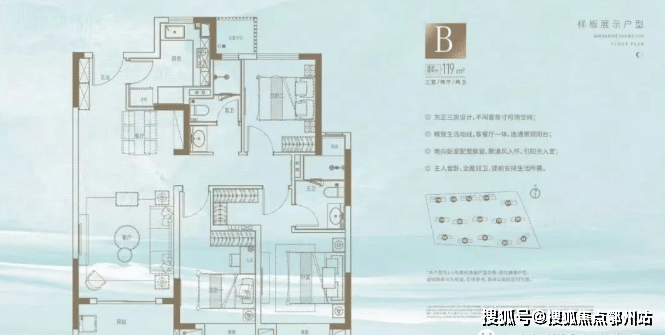 B户型|119平米【3房2厅2卫】√正三房设计,精致生活动线√三开间朝南,全屋双卫√南向卧室配置飘窗,提高空间使用率