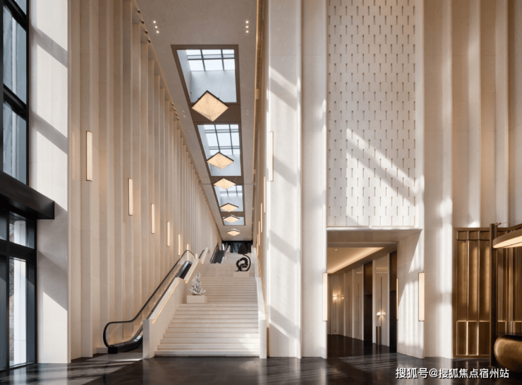 从海派入户旋转门推门而入,第一眼便能看到约13-15米的挑高大堂,艺术阶梯其作为艺术展示的重要空间,最大程度引入自然光,为空间打上朦胧、柔和的光感,融合左右两边的弧形柱体,犹如登山之“径”,随着脚步一步步叠加行进的趣味,沉浸的归家体验感随空间变化逐渐递增。