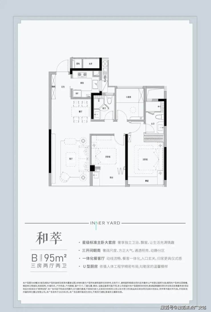 :三房两厅两卫的经典格局,户型方正,空间利用率高。客厅与餐厅相连,形成宽敞的活动空间,外接景观阳台,采光通风极佳,让您在室内也能欣赏到窗外的美景。U 型厨房设计,操作方便,让烹饪成为一种享受。主卧套房设计,配备独立卫生间,保障主人的私密性