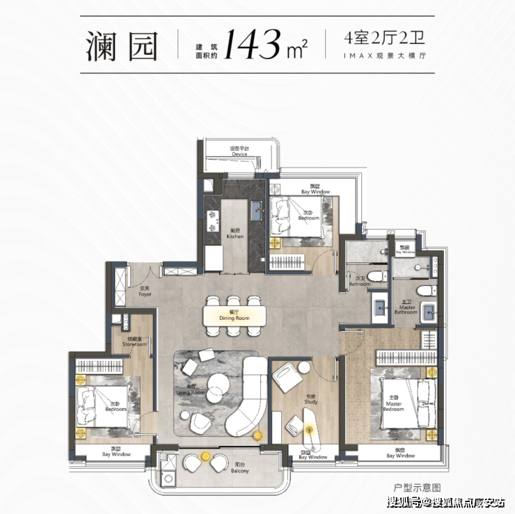 另外,一个优秀户型应该有的设计,包括入户玄关、3间卧室带飘窗、约270度采光面阳台、卫浴干湿分离...这个户型全部具备。
