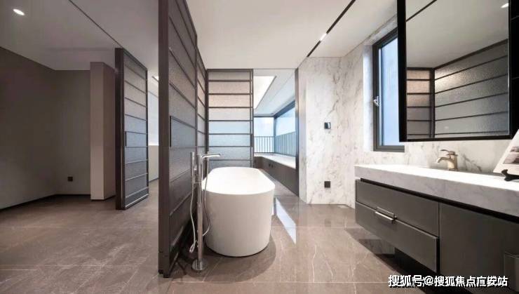 主卫不同于以往,采用了三分离的设计,另外还带有浴缸、双台盆,并且有完整的洄游动线,洗完澡后可以直接推开南面的移门。