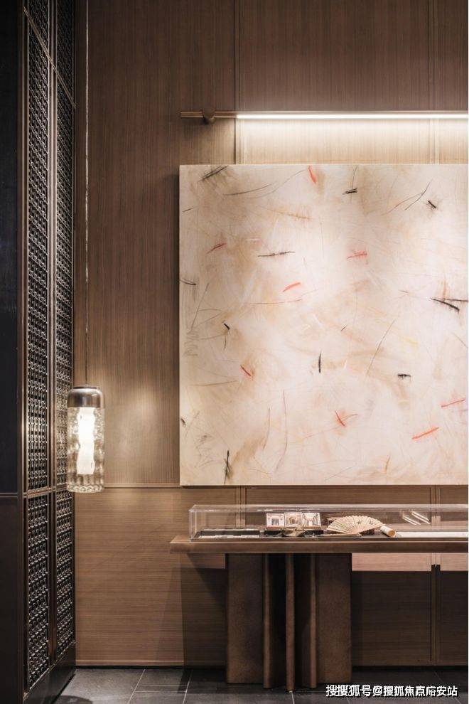 例如,在归家的动线上,保利以古代“提灯夜游”为灵感,将“灯”这一意向穿插其中——在公区入户大堂内,造型别致的壁灯格外惹眼,其灵感来自于“中国古典豆形灯”;落壁灯则是以古铜不锈钢搭配仿透光云石灯具,营造出朦胧的光晕氛围,颇具东方意蕴。