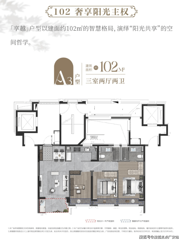 这套建面约103㎡动静分离户型打破常规,兼具三个房间和南向超阔面宽的横厅,以此承载从二人世界到三代同堂的全生命周期需求。