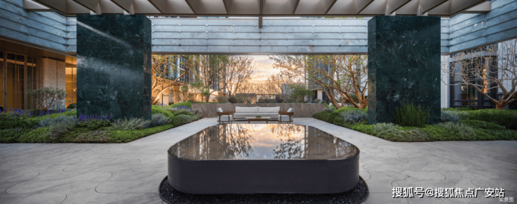 庭院中遍布着睡莲,从这里往出去像一幅画,高低层次的叠水景观,超大型的原石,还有私密的谈话空间,舒适惬意。