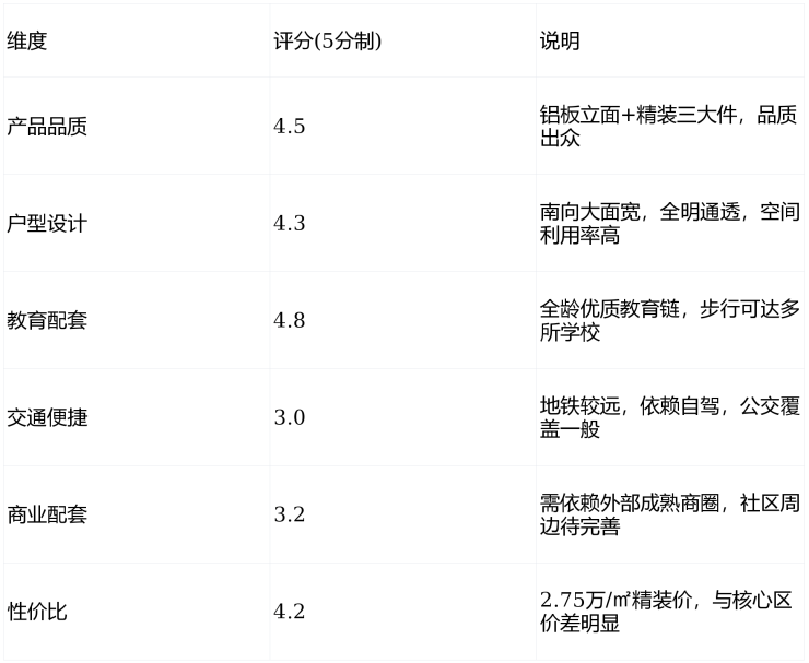 核心结论速览:该项目以铝板外立面与精装三大件为品质亮点,教育资源密集、户型面宽出色、性价比高;主要短板在地铁通勤、周边商业成熟度、部分楼栋采光与交付小问题。适合重视教育与居住品质、预算友好的刚需/刚改家庭,对地铁依赖度高者需谨慎。