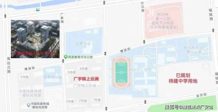 1公里内有文汇学校、下沙二小,1.2公里处在建文瀚学校(九年一贯制公办),2公里内覆盖下沙中学、元成幼儿园等6所优质学校