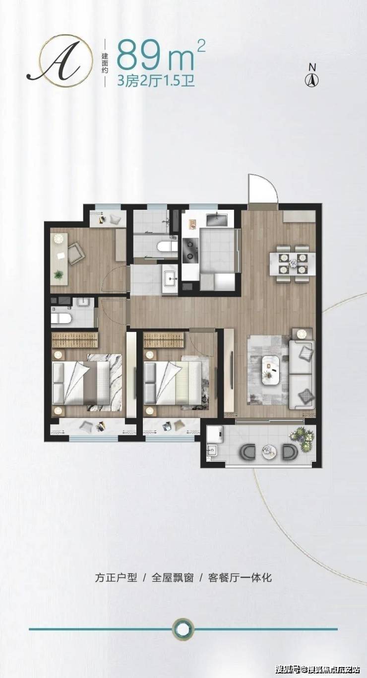 建面约89㎡做3房,功能性上就占尽先机,没想到项目还有1.5卫配置,主卧升级套房,真正实现一步到位!
