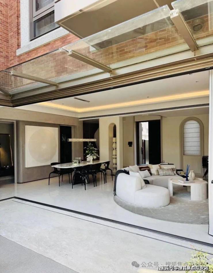 「无界空间」:客厅270度转角无柱设计,搭配落地玻璃,开阔视野将院中风景迎入日常。