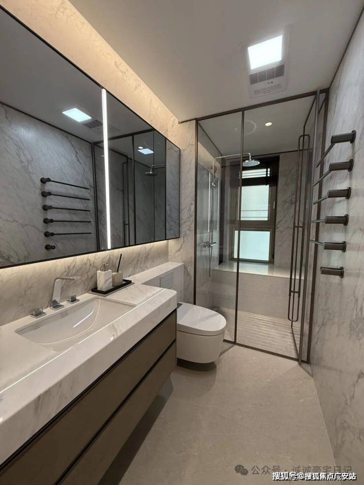 厨卫方面,西厨定制高柜,容纳嘉格纳蒸烤一体机、嘉格纳双开门冰箱、洗手台以及各类收纳空间;中厨自带嘉格纳灶具、油烟机和洗碗机。主卫配置劳芬台盆、浴缸和独立卫浴洁具空间、独立淋浴空间配备当代的花洒,顶部有松下暖风机,还配置了电热毛巾架。
